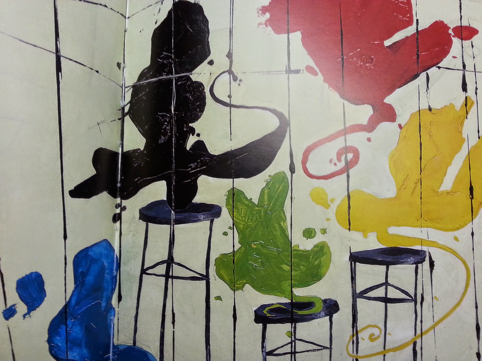 La storia racconta di 5 macchie di pittura, selvagge, fresche, con grande voglia di macchiare, che erano state rinchiuse da Joan Mirò nel suo studio. Le macchie, rossa, gialla, azzurra, nera e verde volevano scappare a tutti i costi dallo studio.